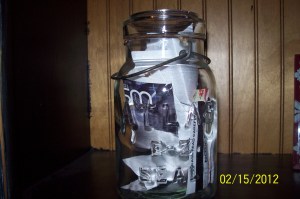 So far my jar has Sabres tickets, a lift pass from Colden Tubing Company, a note about the Super Bowl party we had, a note from a day when Allen took the girls sledding, and some notes about a few milestones for the kids (“Emery started gymnastics” “Casey and her best friend went ice skating and had a sleepover”). There are also a few movie tickets, the ticket from a banquet we attended this past weekend, and yes, our hotel room key.